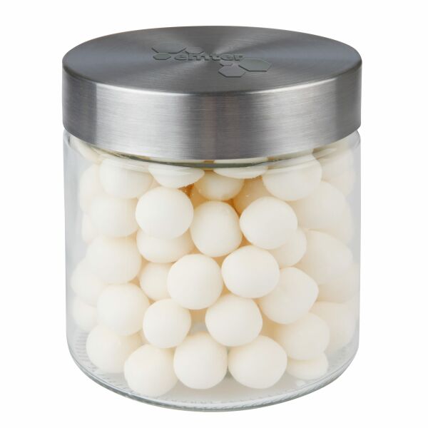 Glazen pot met RVS deksel 0,9 liter voorzien van embossing op het deksel en gevuld met Wilhelmina pepermunt