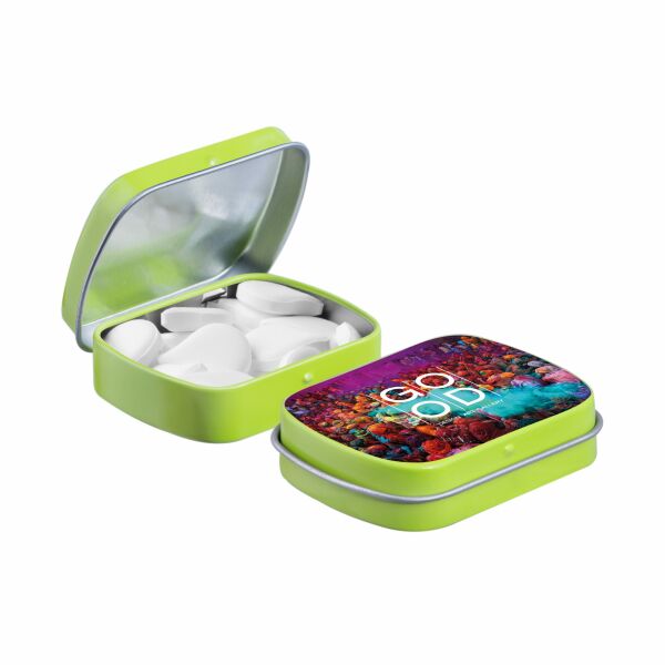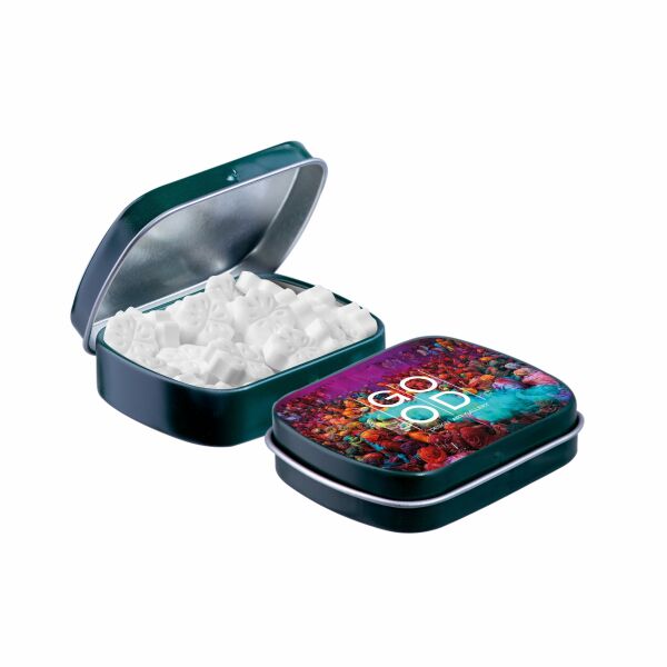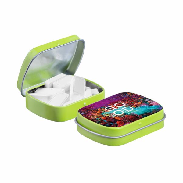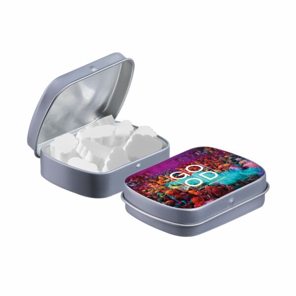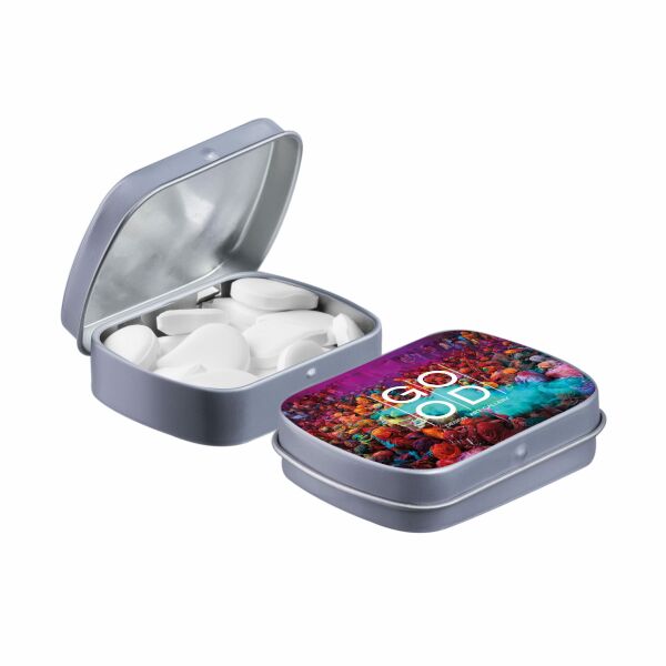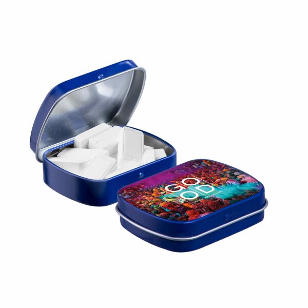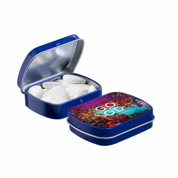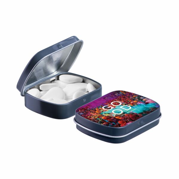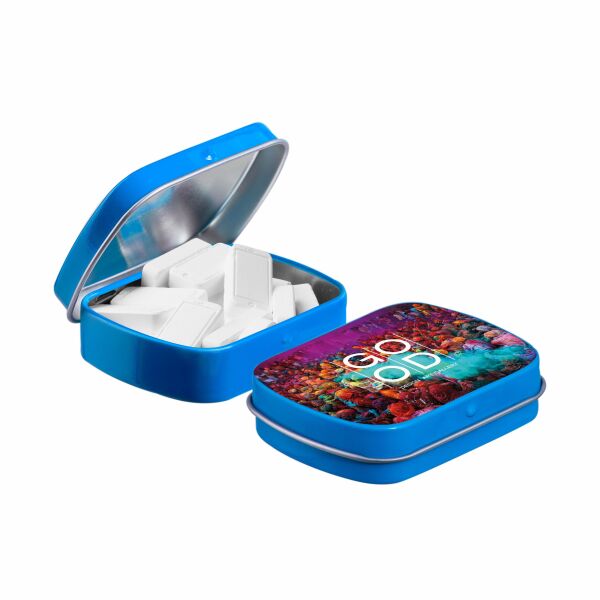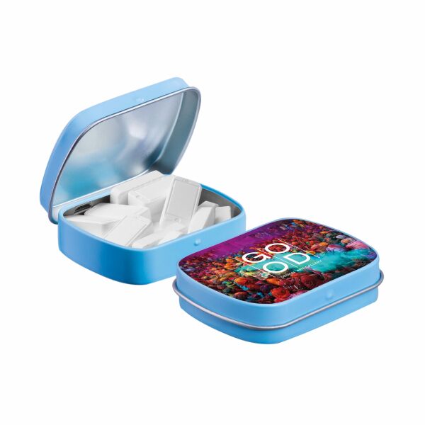 Lichtblauw mini scharnierblikje, gevuld met ca. 23 gram pepermunt in de vorm van een Vrachtwagen. Voorzien van en full colour bedrukking, inclusief ingrediëntensticker en seal.