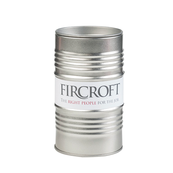 Blikje in de vorm van een olievat. Het blikje wordt in het midden rondom voorzien van een full colour bedrukte sleeve. (andere vulling op aanvraag)