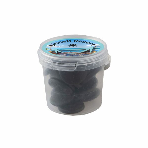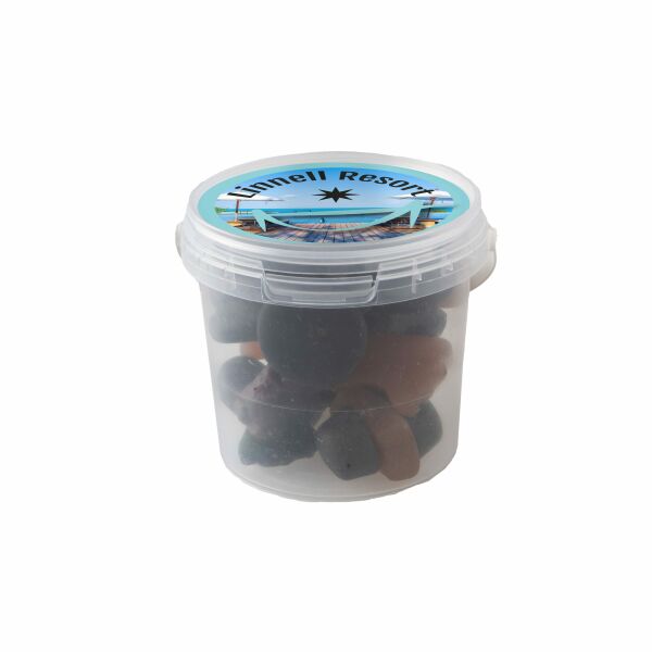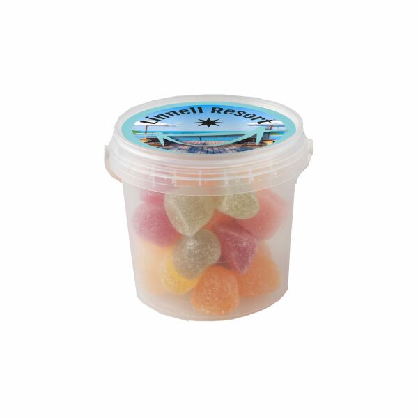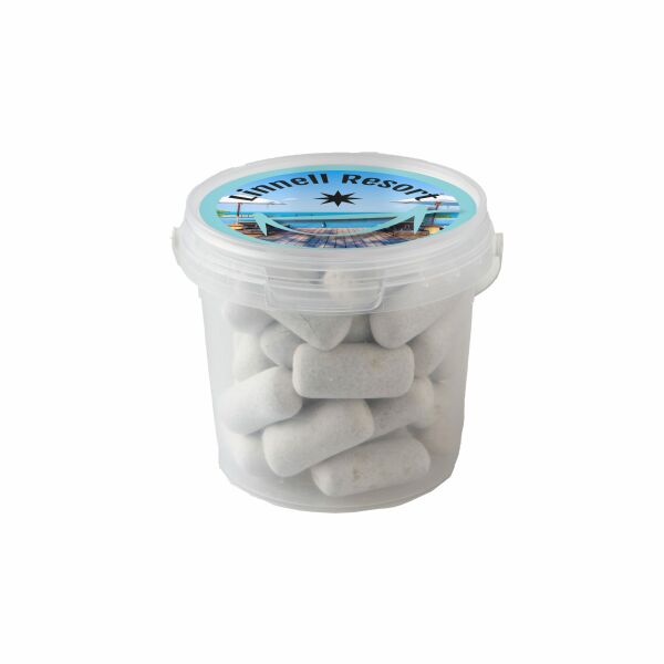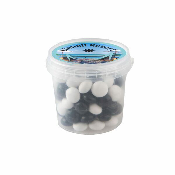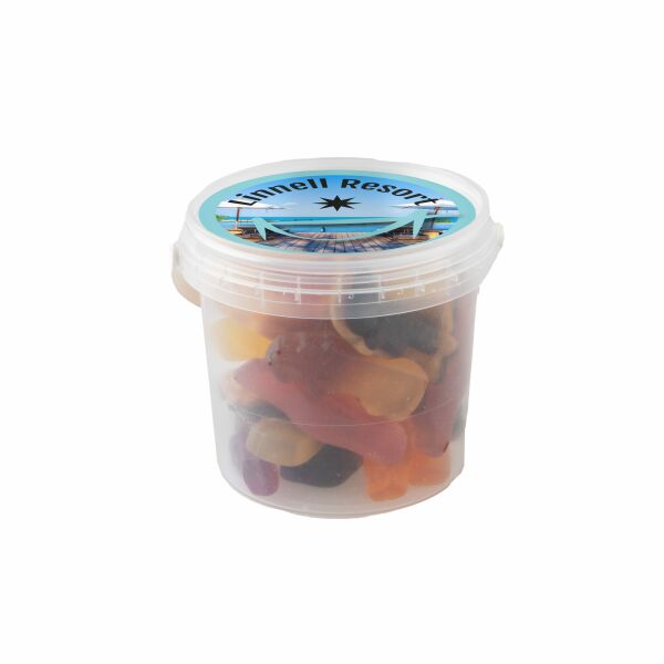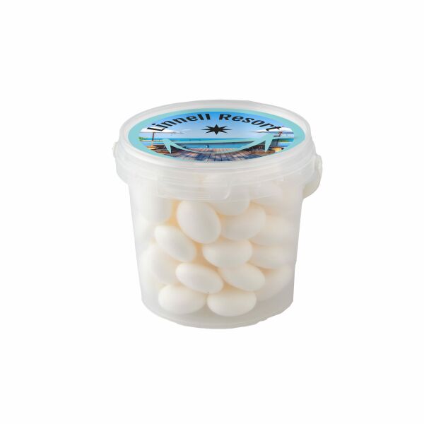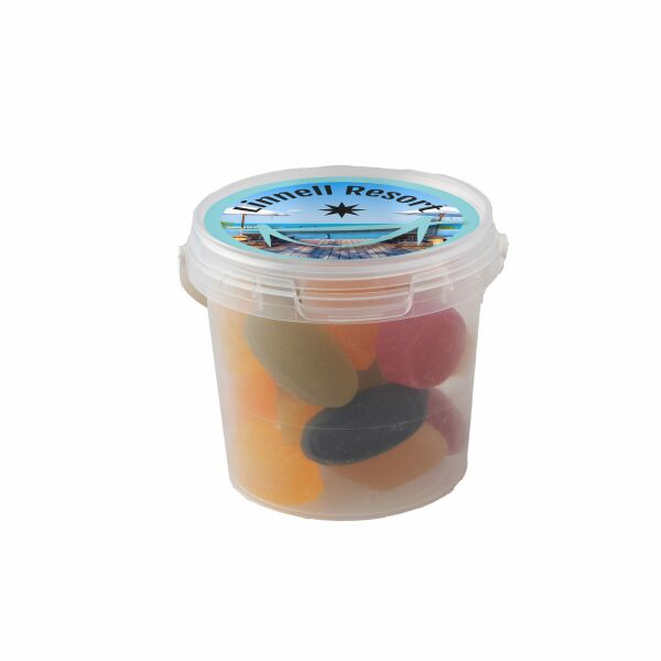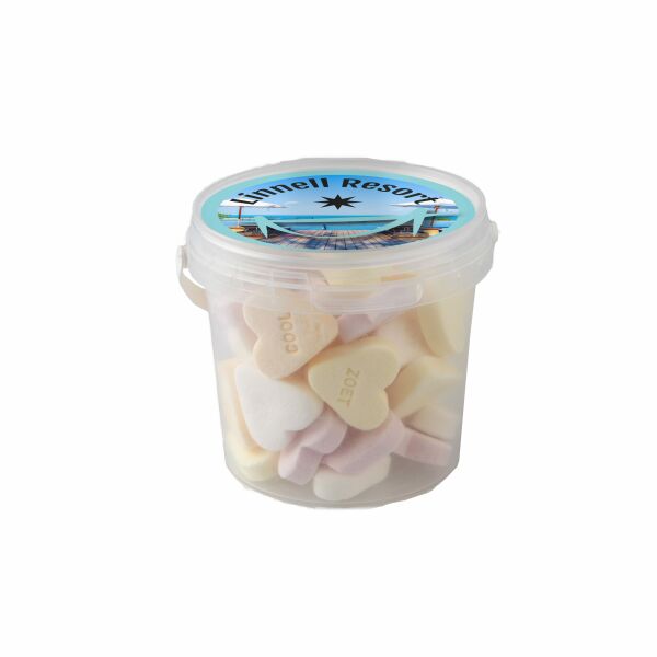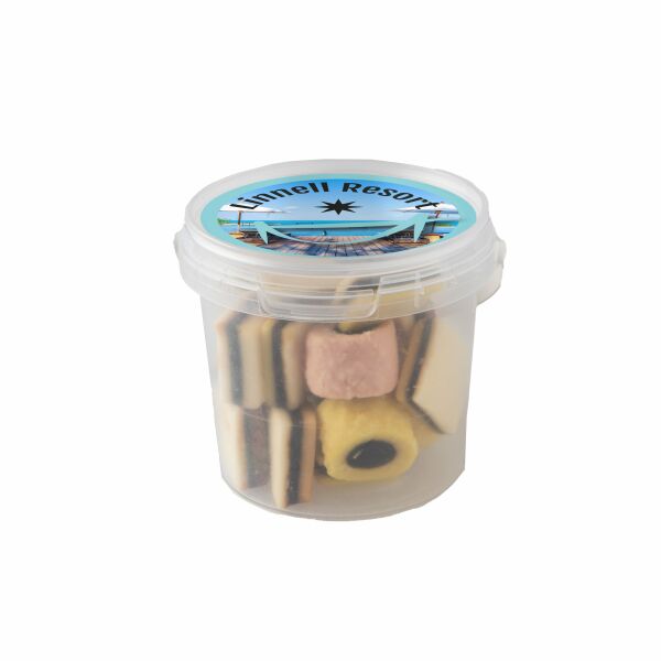 Transparant mini emmertje gevuld met ca. 160 gram Dropstaafjes mix en voorzien van een full colour sticker op het deksel