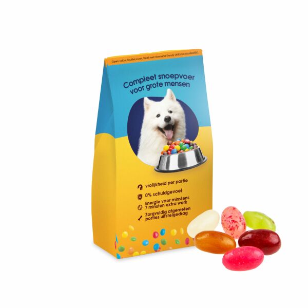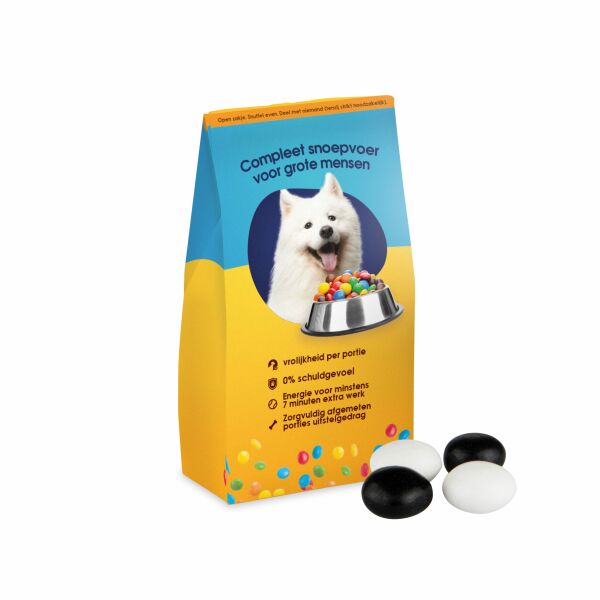 Voerzakje all-over full colour bedrukt, gevuld met snoep. Andere vullingen zijn op aanvraag leverbaar.