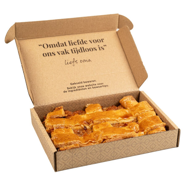 De bekendste Brievenbustaart van Nederland. Ambachtelijk bereid met verse Betuwse appels.Niets lekkerder dan verse appeltaart toch? Oma’s Brievenbus Appeltaart zit boordevol appelen uit de Betuwe. En die zijn ook nog eens duurzaam geteeld! Oma gebruikt voor haar versie Elstars en Goudreinetten. Doordat ze in het deeg echte roomboter, een heerlijke snuf kaneel en lekkere rozijntjes stopt, krijgen de appeltjes het jasje dat ze verdienen. Oma’s Brievenbus Appeltaart wordt volgens een oud familierecept gebakken. Hoe vaak je ook een puntje neemt, het zal je blijven verbazen dat een simpel stukje fruit op knapperig deeg zo’n waanzinnige traktatie is! De brievenbustaart wordt gepersonaliseerd met een eetbaar logo, gedrukt met eetbare inkt op een suikerplaatje.
