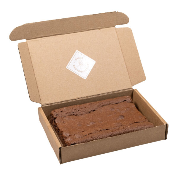 Chocola, wie houdt er niet van? Oma Lenie is er in ieder geval dol op! Ze vindt het ook nog eens heerlijk om er mee te bakken. De heerlijke Oma’s Brievenbus Brownie is smeuïg van binnen, maar heeft ook een goeie bite van buiten. Precies zoals je hem graag eet. Hij is niet te versmaden bij een warme kop thee, maar doet het ook goed als afsluitend dessert van een gezellige maaltijd! Gemaakt van de allerbeste pure chocola en bereidt met verse roomboter. En zoals Oma altijd zegt: ‘Een stukje chocola lost je problemen niet op, maar dat doet een banaan ook niet!’ De brievenbustaart wordt gepersonaliseerd met een eetbaar logo, gedrukt met eetbare inkt op een suikerplaatje.