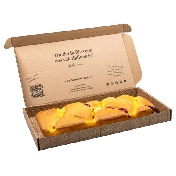 Onze Brievenbus Kersencake is heerlijk bij de frisse voorjaarsdagen. Bereid met 100% roomboter en smaakvolle gele room gecombineerd met heerlijke kersen vormt deze Kersencake een echte Betuwse klassieker. Een heerlijk smeuïge cake perfect om jouw relaties te verrassen. De brievenbustaart wordt gepersonaliseerd met een eetbaar logo, gedrukt met eetbare inkt op een suikerplaatje.