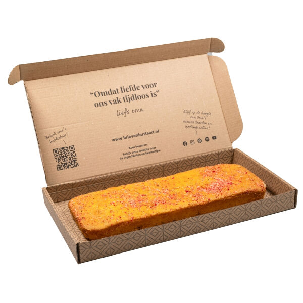 Het voorjaar staat weer voor de deur en daar heeft Oma natuurlijk iets speciaals voor bedacht. Deze bijzondere cake bezit de heerlijke smaak van sinaasappel en een vleugje limoen wat een fris karakter geeft aan deze cake. Bereid met 100% natuurlijke roomboter en gedocoreerd met kokossnippers. De brievenbustaart wordt gepersonaliseerd met een eetbaar logo, gedrukt met eetbare inkt op een suikerplaatje.