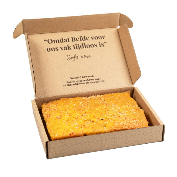 Het voorjaar staat weer voor de deur en daar heeft Oma natuurlijk iets speciaals voor bedacht. Deze bijzondere cake bezit de heerlijke smaak van sinaasappel en een vleugje limoen wat een fris karakter geeft aan deze cake. Bereid met 100% natuurlijke roomboter en gedocoreerd met kokossnippers. De brievenbustaart wordt gepersonaliseerd met een eetbaar logo, gedrukt met eetbare inkt op een suikerplaatje.